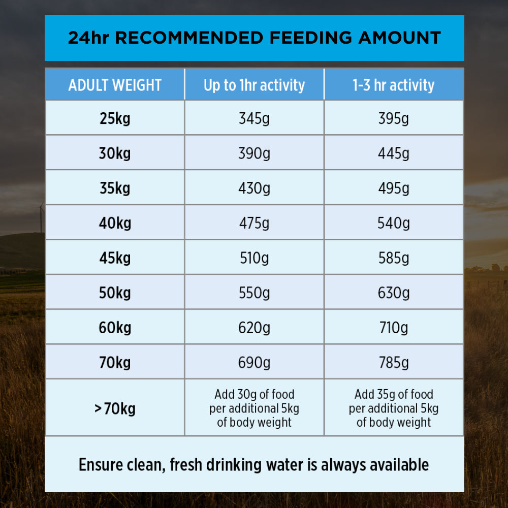 | >70kg | Add 30g of food per additional 5kg of body weight | Add 35g of food per additional 5kg of body weight |