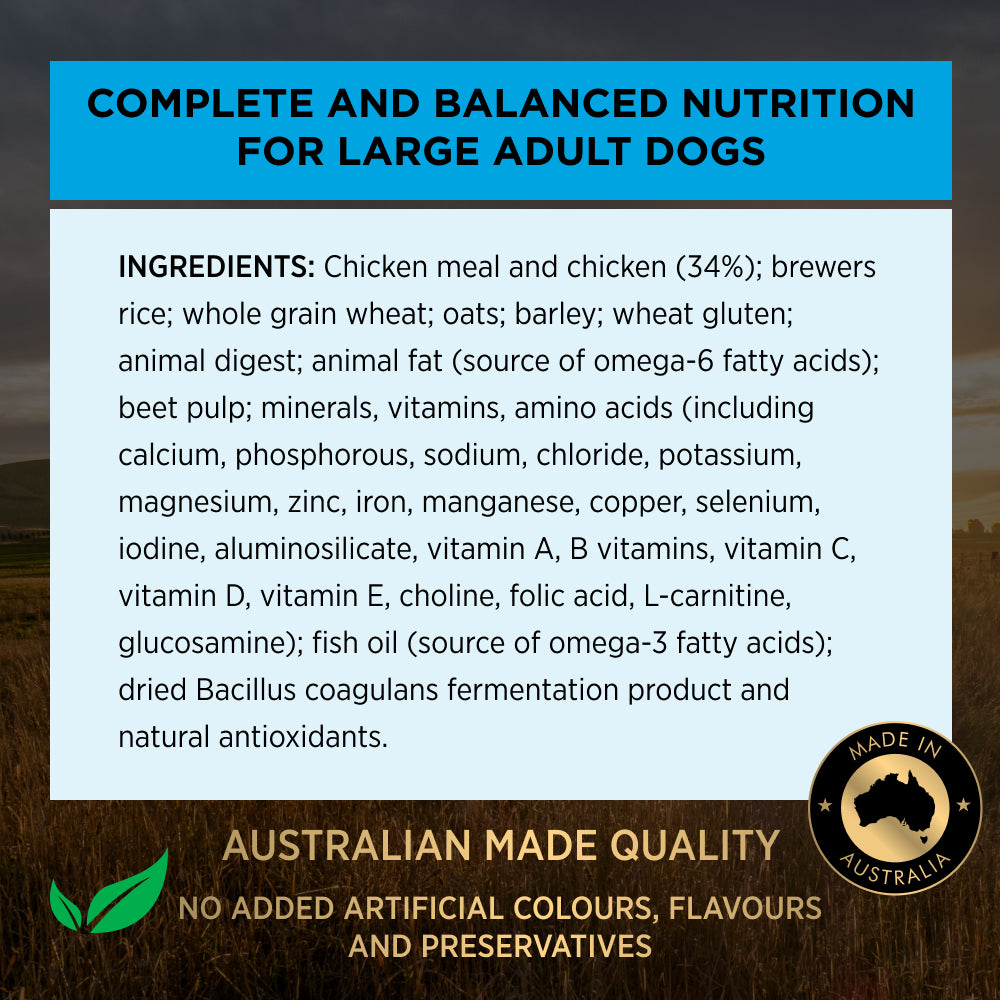 Chicken meal and Chicken (34%); brewers rice; whole grain wheat; oats; barley; wheat gluten; animal digest; animal fat; beet pulp; minerals, vitamins, amino acids (including calcium, phosphorous, sodium, chloride, potassium, magnesium, zinc, iron, manganese, copper, selenium, iodine, aluminosilicate, vitamin A, B vitamins, vitamin C, vitamin D, vitamin E, choline, folic acid, glucosamine, L-carnitine); fish oil (source of Omega-3 fatty acids); dried Bacillus coagulans fermentation product and natural antioxidants.
