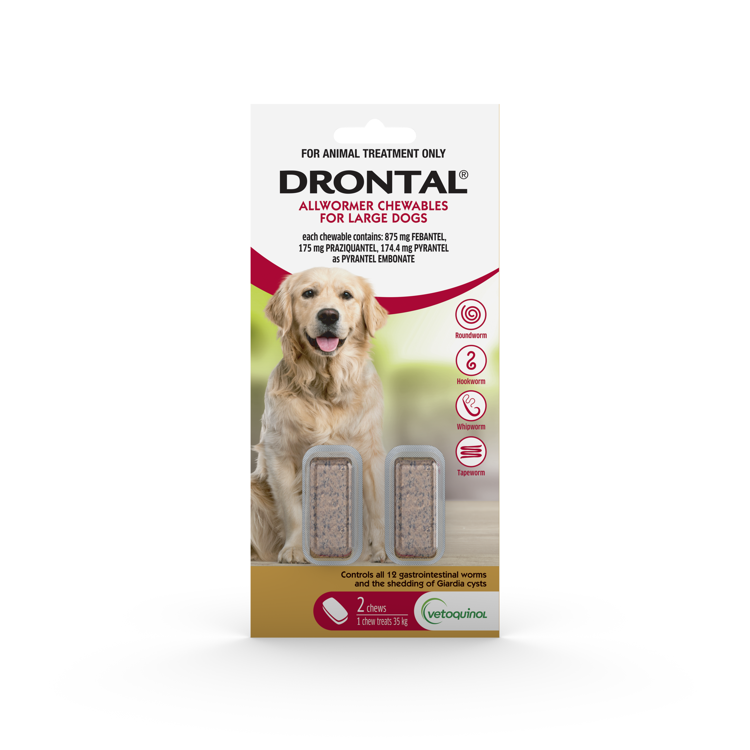 For intestinal worms: One chew treats 35kg. It is essential to weigh dogs before treatment. Fasting prior to dosing is not necessary. Administer the dog’s correct dose by mouth. Most dogs will eat Drontal® chews as a tasty treat. If worm problems persist consult a veterinarian.