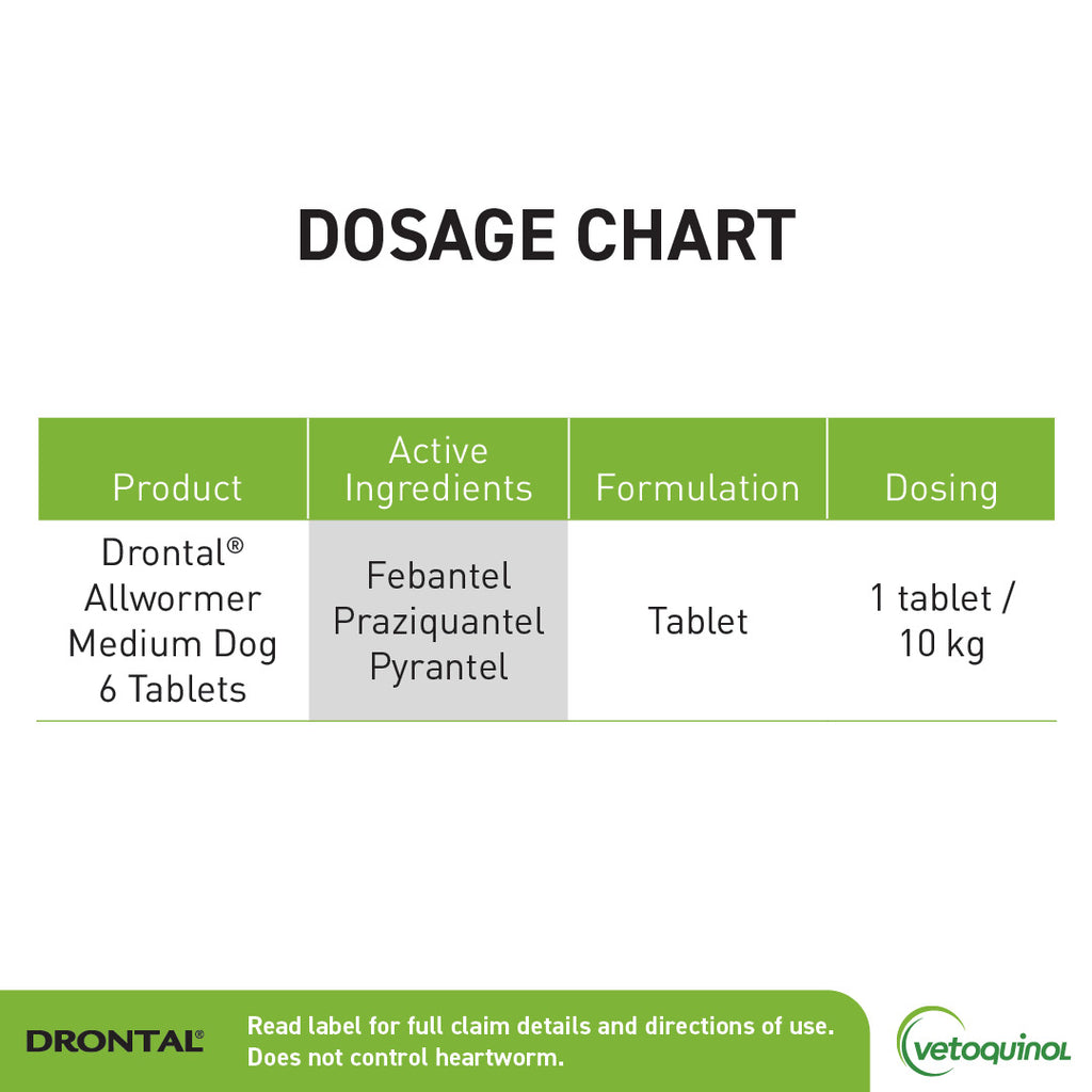 For intestinal worms: One tablet treats 10kg. It is essential to weigh dogs before treatment. Fasting prior to dosing is not necessary. Administer the dog’s correct dose by mouth. If worm problems persist consult a veterinarian.