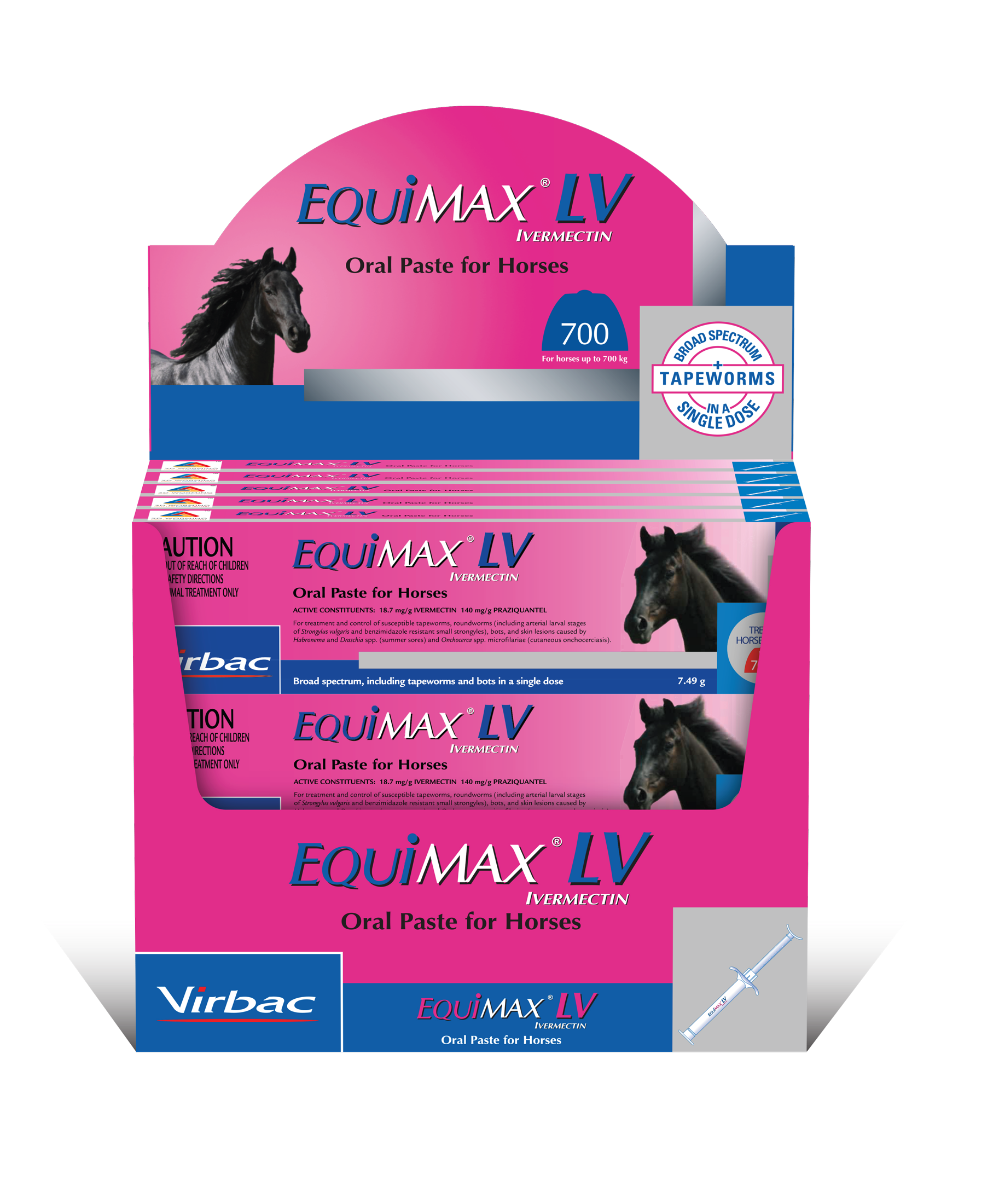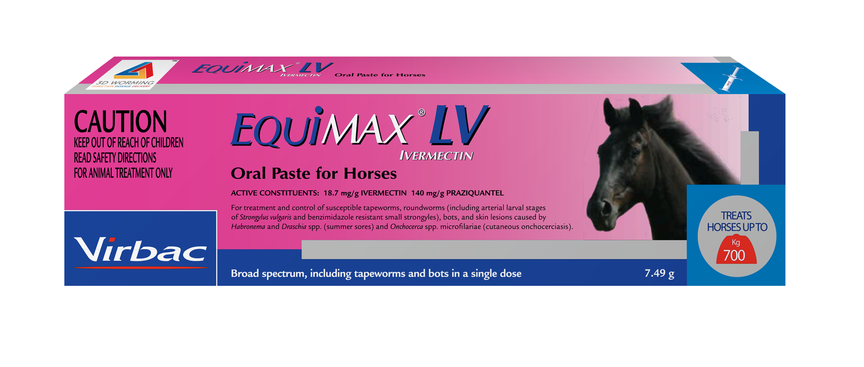 The combination of ivermectin, and praziquantel in EQUIMAX LV provides a broad-spectrum anti-parasiticide for total control of all equine worms, bots, lungworms, intestinal threadworms, tapeworms and skin parasites (summer sores and neck threadworms).