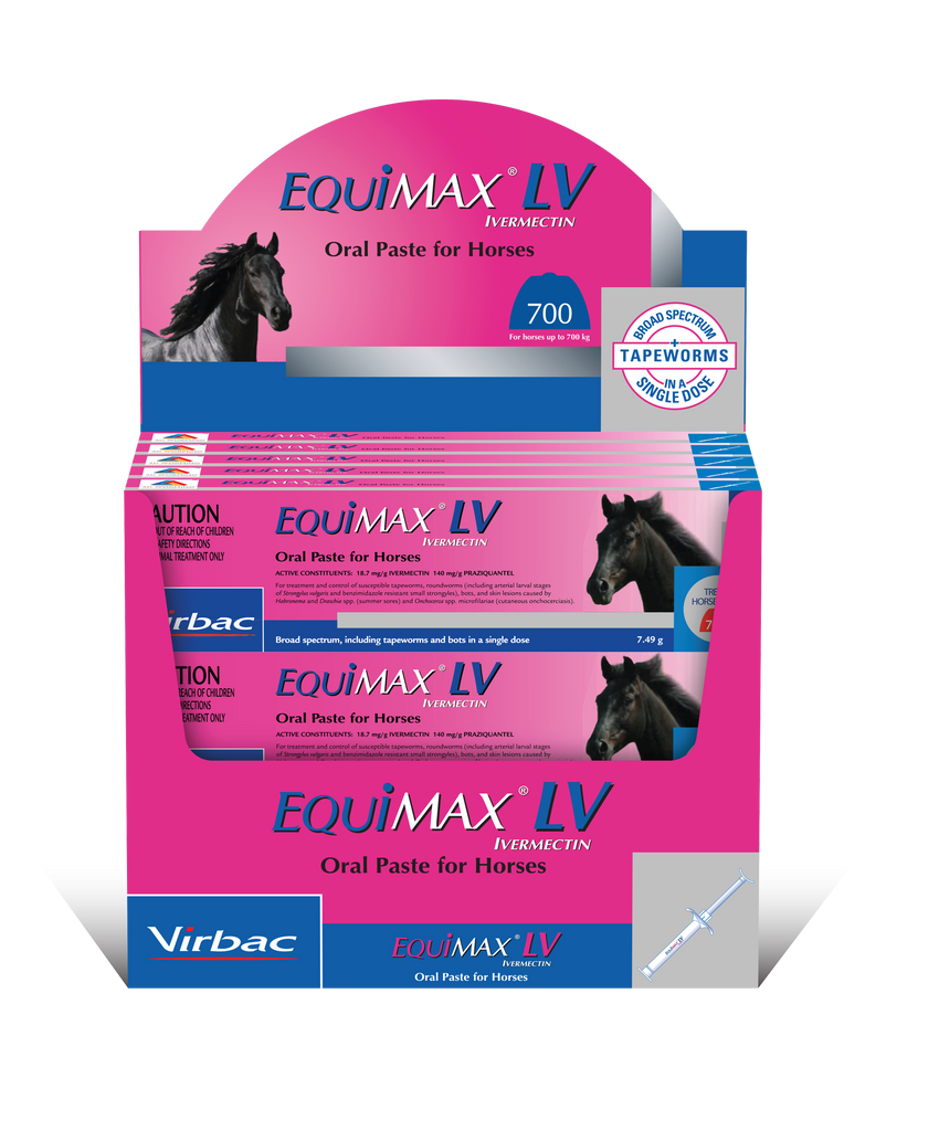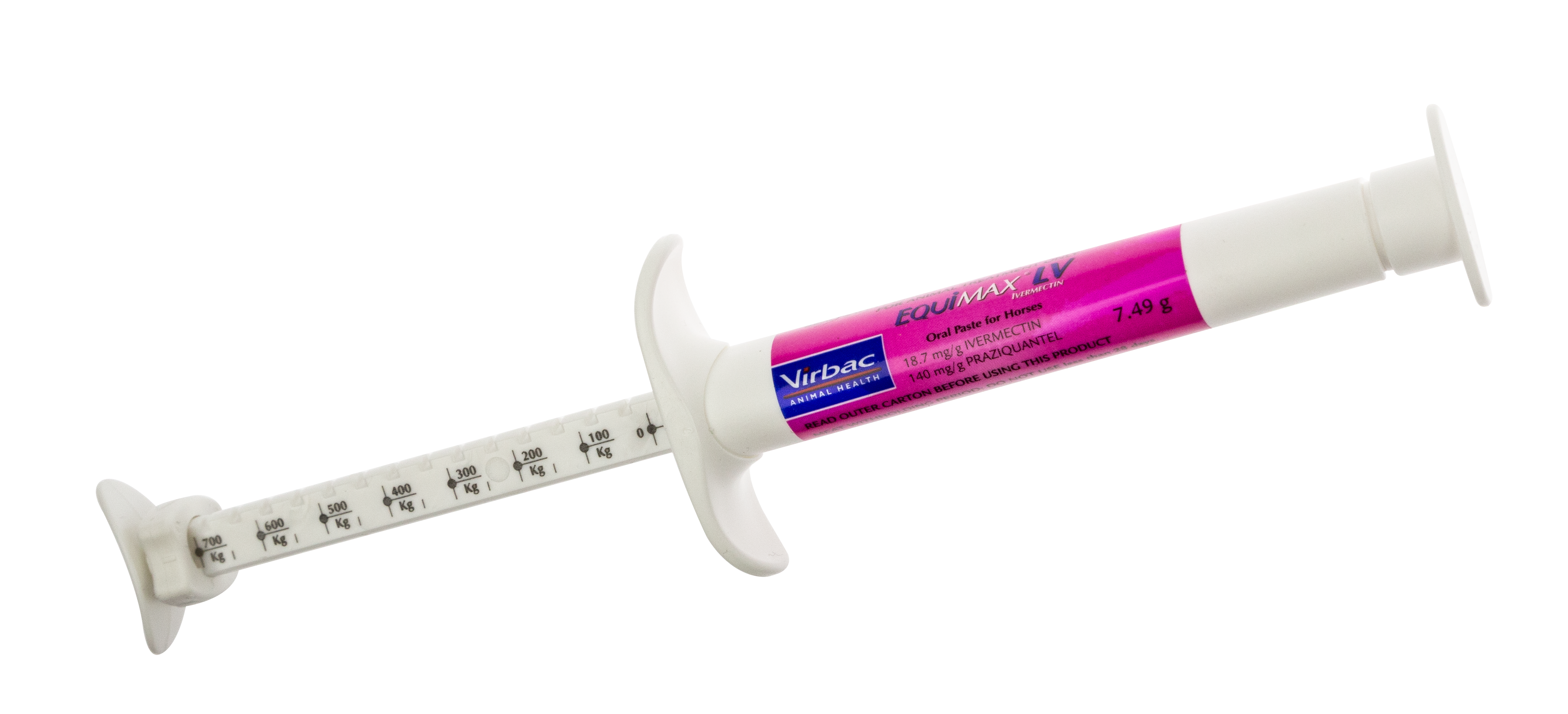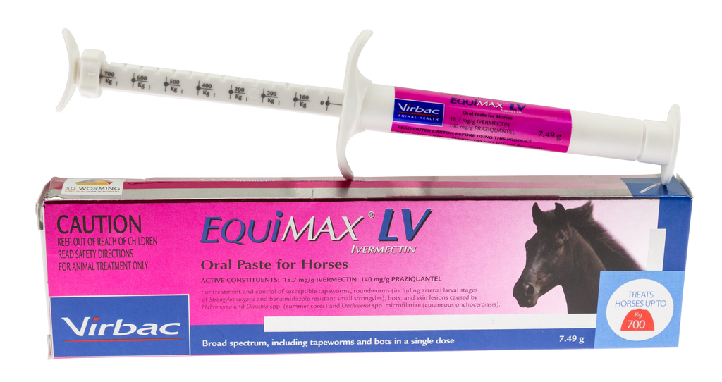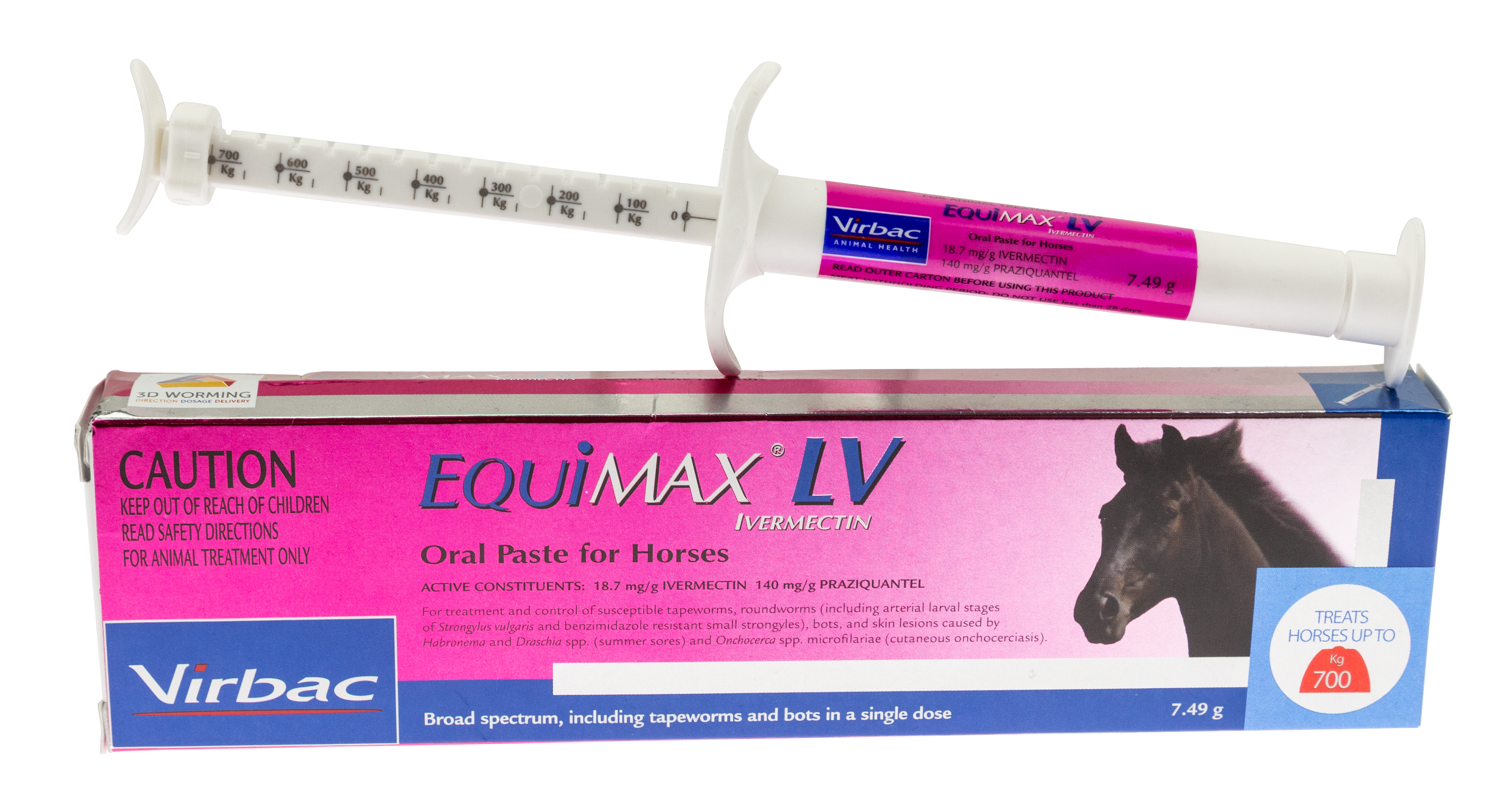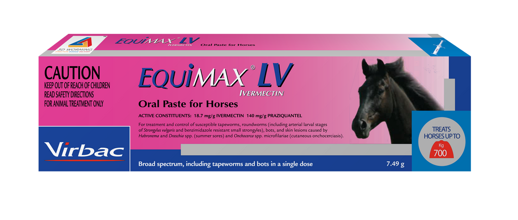 Every horse faces a daily challenge from parasites in the environment and whilst not every horse will show signs of infection, if left untreated the burden of internal parasites such as worms and bots can cause disease and colic. Some of these diseases and colic can be life threatening to your horse. To maintain health and vitality while also reducing the risk of illness you should have your horse on an appropriate worming program. Parasites of major concern are small redworms, tapeworms and ascarids. Regular worm treatments with a broad spectrum product such as EQUIMAX LV will significantly reduce the risk of disease and colic attributable to worms and help to maintain the health and vitality of your horse.