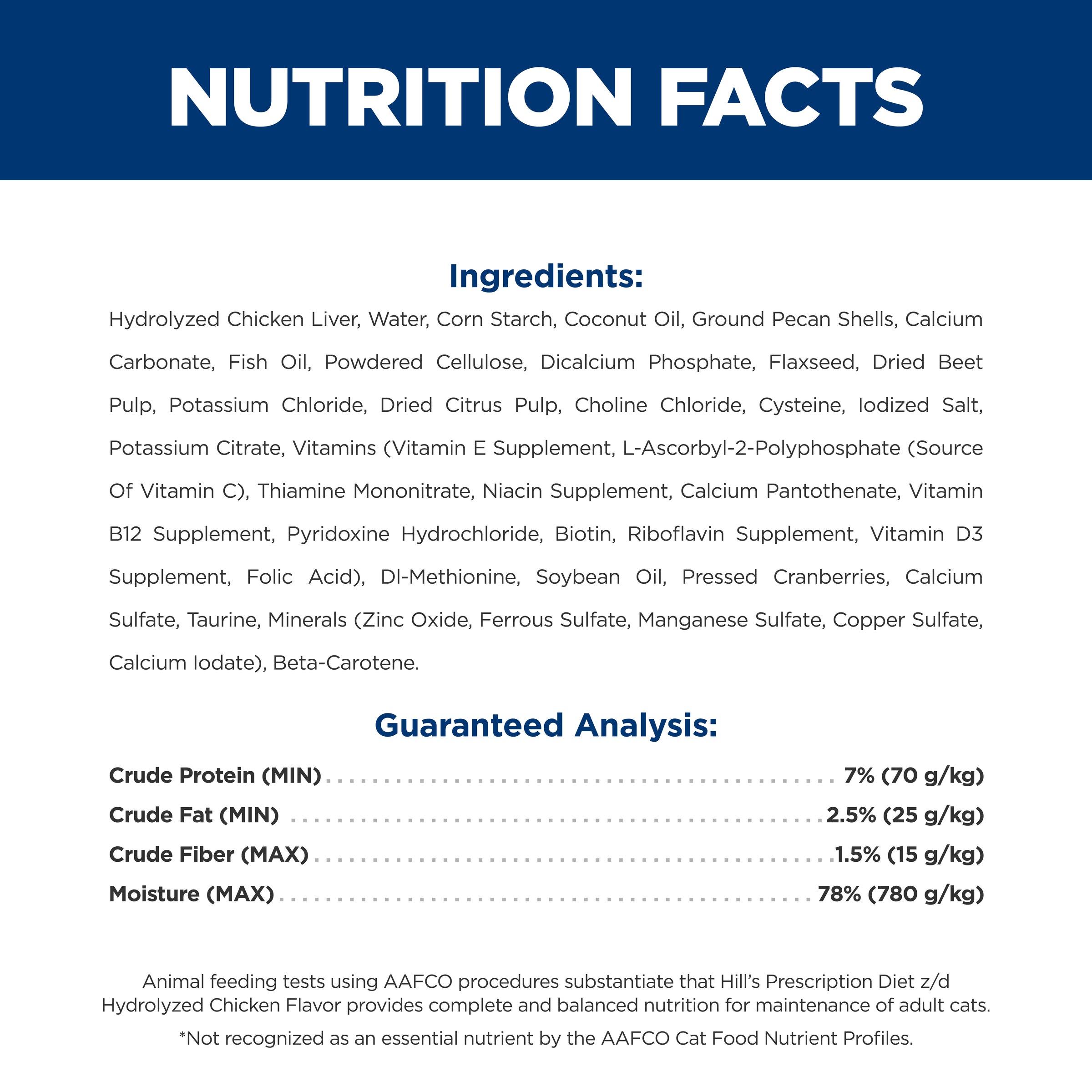 Hydrolyzed Chicken Liver, Water, Corn Starch, Coconut Oil, Ground Pecan Shells, Calcium Carbonate, Fish Oil, Powdered Cellulose, Dicalcium Phosphate, Flaxseed, Dried Beet Pulp, Potassium Chloride, Dried Citrus Pulp, Choline Chloride, Cysteine, Iodized Salt, Potassium Citrate, vitamins (Vitamin E Supplement, L-Ascorbyl-2-Polyphosphate (source of Vitamin C), Thiamine Mononitrate, Niacin Supplement, Calcium Pantothenate, Vitamin B12 Supplement, Pyridoxine Hydrochloride, Biotin, Riboflavin Supplement, Vitamin D3 Supplement, Folic Acid), DL-Methionine, Soybean Oil, Pressed Cranberries, Calcium Sulfate, Taurine, minerals (Zinc Oxide, Ferrous Sulfate, Manganese Sulfate, Copper Sulfate, Calcium Iodate), Beta-Carotene.