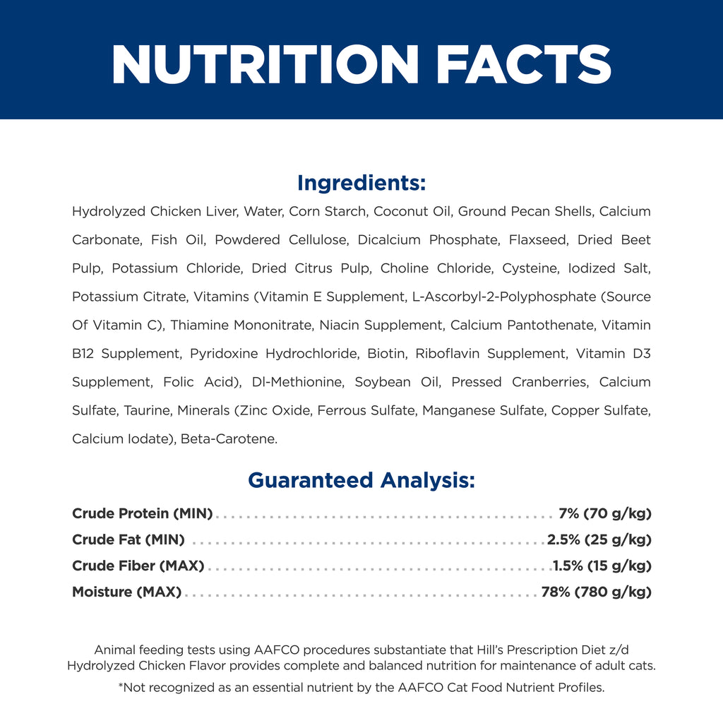 Hill’s Prescription Diet z/d Hydrolysed Wet Cat Food is a highly digestible, great-tasting clinical nutrition formulated to help avoid skin and digestive signs of adverse food reactions in cats. Made without additives known to cause food allergies. Its high digestibility supports easy nutrient absorption and meets the nutritional needs of adult cats.