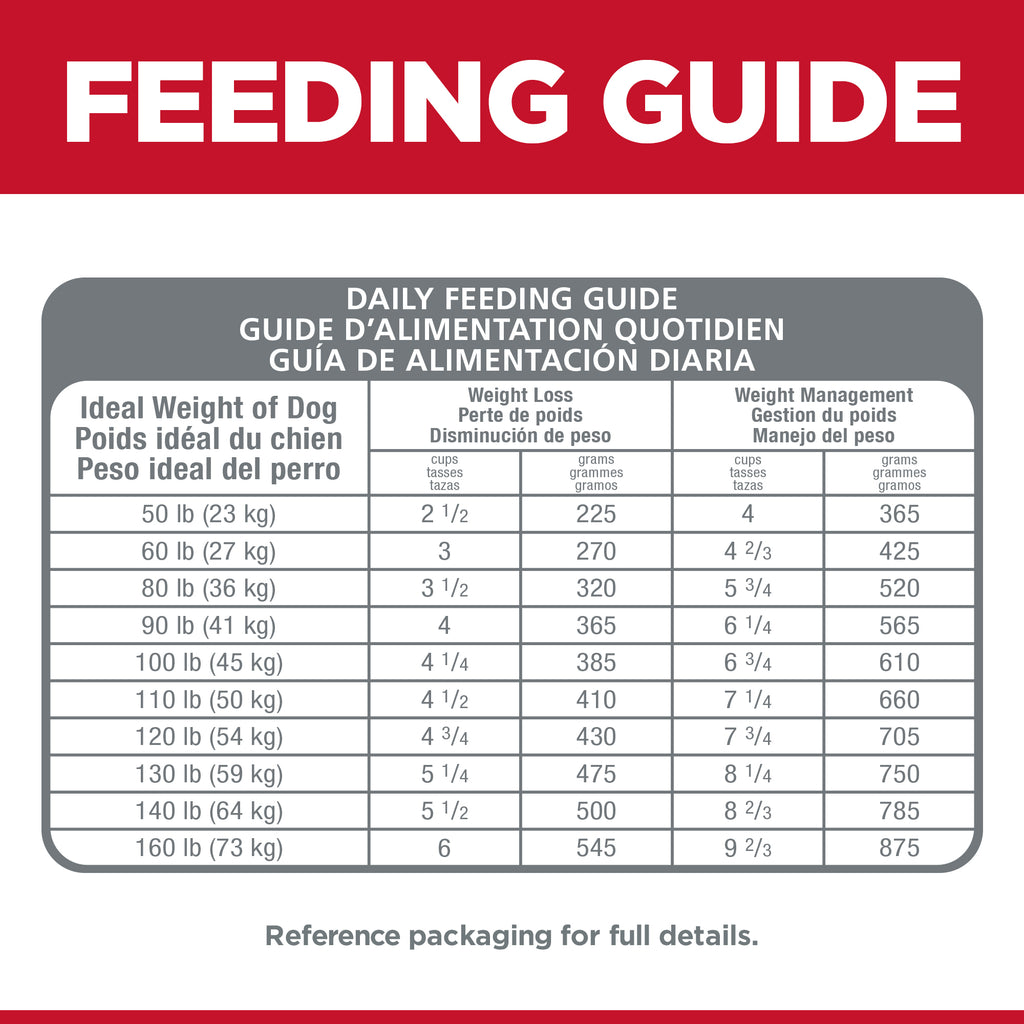 | Ideal Weight of Dog | Weight Loss (cups / grams) | Adult Maintenance (cups / grams) |