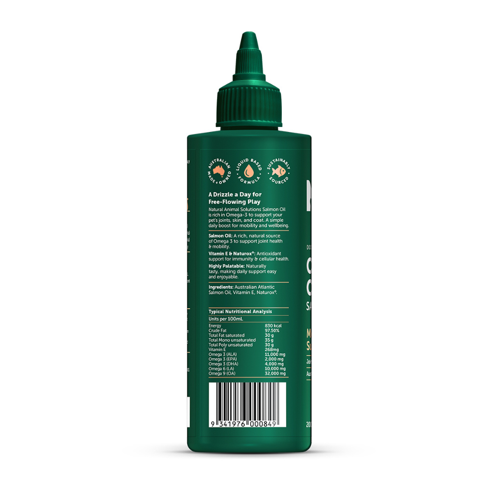 Australian Salmon Oil: A rich, natural source of EPA & DHA to support joint health, mobility, and a shiny, healthy coat.