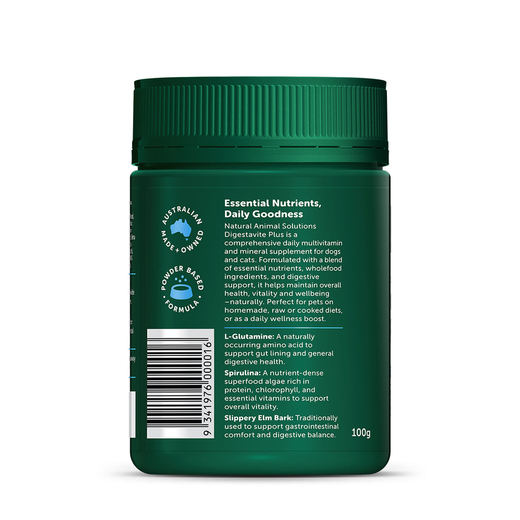 Feeding your pet a high quality, well-balanced and complete food is one of the most important decisions you will make to ensure your pet remains strong and healthy for life. So how do you know your pet is getting the right vitamins and nutrients in their diet?DigestaVite Plus is a great tasting, mega-complex dietary supplement containing 46 essential vitamins, minerals, pre-biotics and anti-oxidants sourced from high quality, natural ingredients.Designed to give maximum support for digestive tract, stomach, immune system, skin and coat, while also assisting to detox the liver and overall digestive system. DigestaVite Plus is the perfect compliment to your pets diet, ensuring they have all the vitamins and minerals necessary for a complete and balanced diet.Your pet will benefit in many ways from only one small serve per day. Our low serve rate makes it cost-effective and easy to supplement your pets diet. In many cases you will see the benefits within days as your pet absorbs all the necessary nutrients to support their overall health and wellbeing