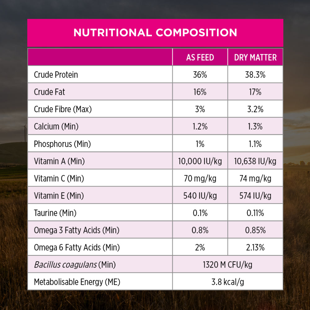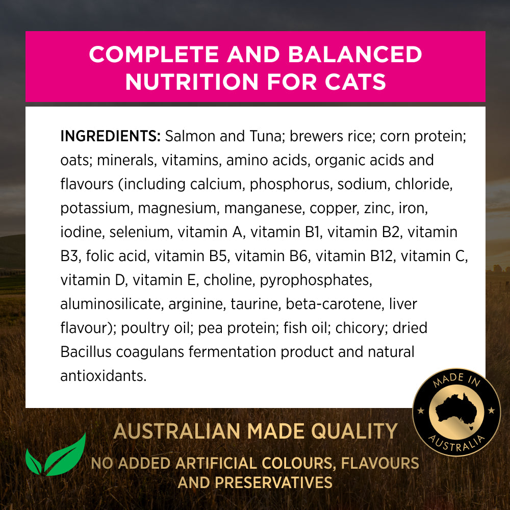 Salmon and Tuna; brewers rice; corn protein; oats; minerals, vitamins, amino acids, organic acids and flavours (including calcium, phosphorus, sodium, chloride, potassium, magnesium, manganese, copper, zinc, iron, iodine, selenium, vitamin A, vitamin B1, vitamin B2, vitamin B3, folic acid, vitamin B5, vitamin B6, vitamin B12, vitamin C, vitamin D, vitamin E, choline, pyrophosphates, aluminosilicate, arginine, taurine, beta-carotene, liver flavour); poultry oil; pea protein; fish oil; chicory; dried Bacillus coagulans fermentation product and natural antioxidants.