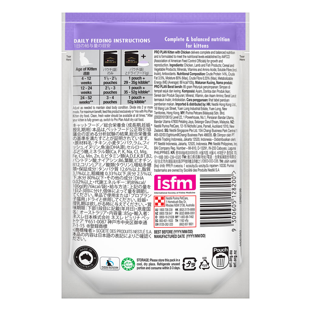 PRO PLAN® Kitten contains DHA to nourish the brain and vision development as well as antioxidant to help build the immune system enabling your kitten the best start at life. It is made with real Chicken in a tasty Jelly for a delicious flavour your Kitten will love.
