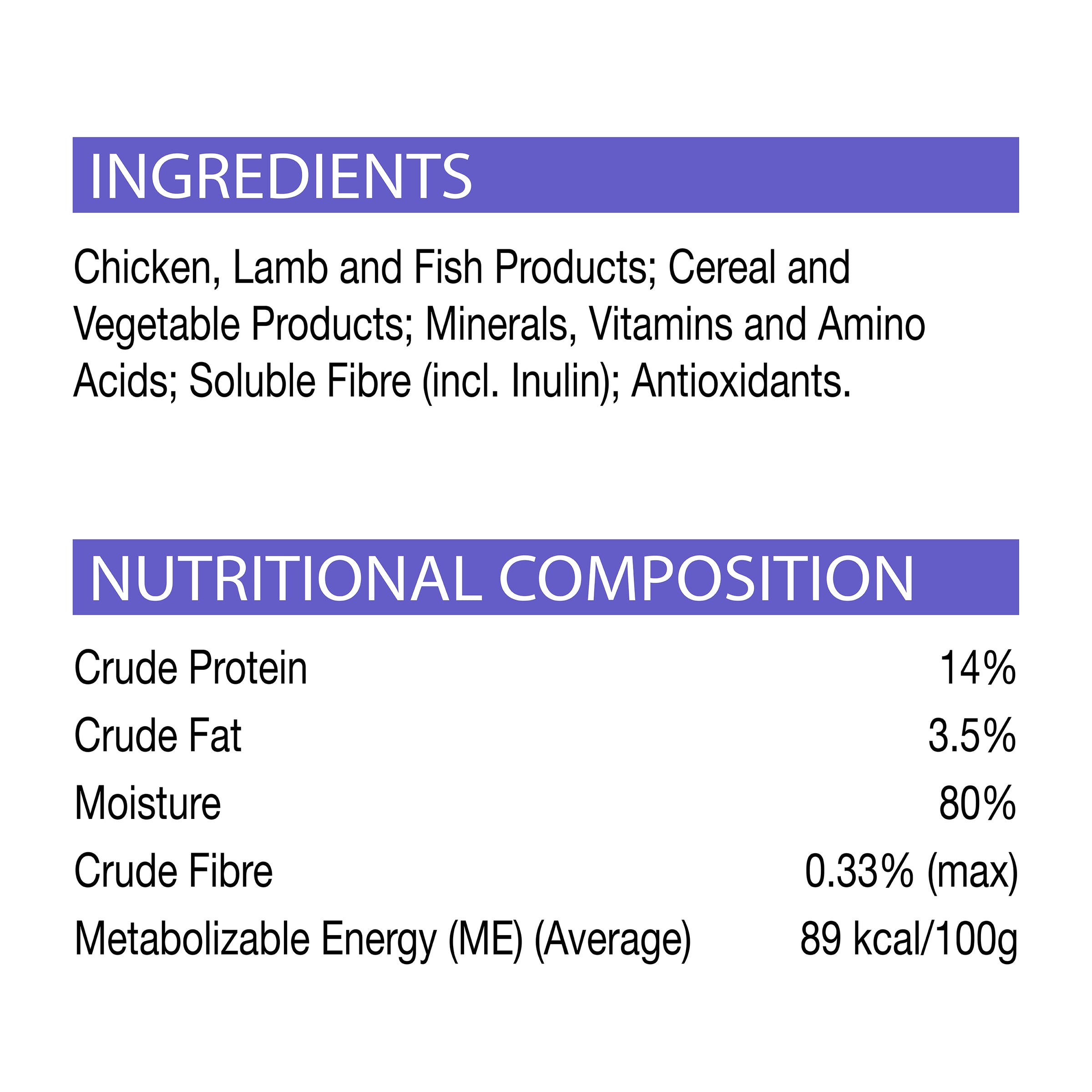 Chicken, Lamb and Fish Products; Cereal and Vegetable Products; Minerals, Vitamins and Amino Acids; Soluble Fibre (incl. Inulin); Antioxidants