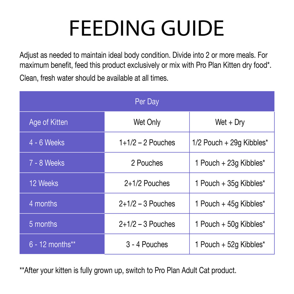 Divide into 2 of more meals. For maximum benefit, feed this product exclusively or mix with PRO PLAN® Kitten dry food*