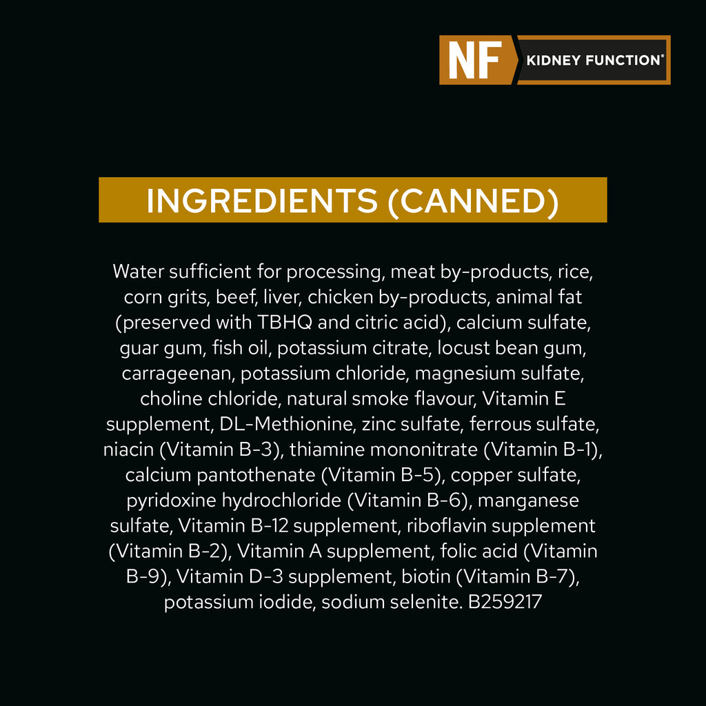 Water Sufficient for Processing, Meat By-Products, Rice, Corn Grits, Beef, Liver, Chicken By-Products, Animal Fat (Preserved with TBHQ and Citric Acid), Calcium Sulfate, Guar Gum, Fish Oil, Potassium Citrate, Locust Bean Gum, Carrageenan, Potassium Chloride, Magnesium Sulfate, Choline Chloride, Natural Smoke Flavor, Vitamin E Supplement, Zinc Sulfate, Ferrous Sulfate, Niacin (Vitamin B-3), Thiamine Mononitrate (Vitamin B-1), Calcium Pantothenate (Vitamin B-5), Copper Sulfate, Pyridoxine Hydrochloride (Vitamin B-6), Manganese Sulfate, Vitamin B-12 Supplement, Riboflavin Supplement (Vitamin B-2), Vitamin A Supplement, Folic Acid (Vitamin B-9), Vitamin D-3 Supplement, Biotin (Vitamin B-7), Potassium Iodide, Sodium Selenite. B259217.