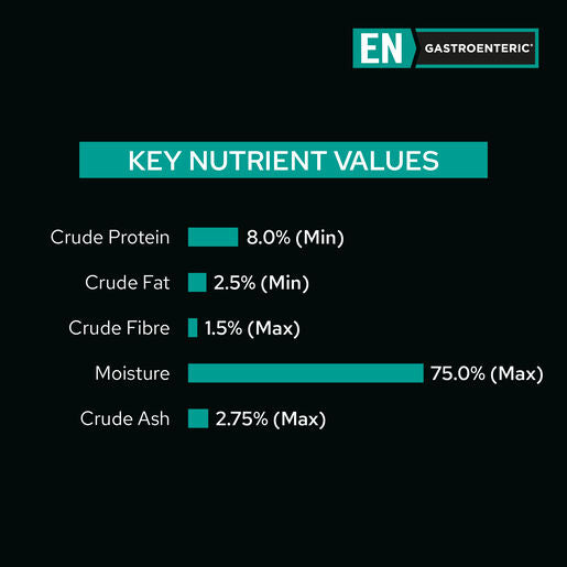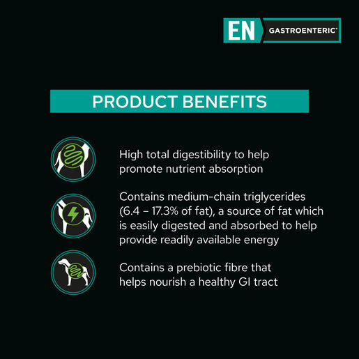 Gastrointestinal upset can be caused by many factors including indiscretionary eating, parasites, and infectious agents, which generally impairs a dog’s ability to digest and absorb nutrients. Common symptoms include loss of appetite, vomiting, and diarrhea. PRO PLAN Veterinary Diets Canine EN Gastroenteric is easy to digest and formulated with low fibre and contains a moderate amount of easily digestible fat to ease digestion and provide high-quality nutrition for the long-term maintenance of dogs.