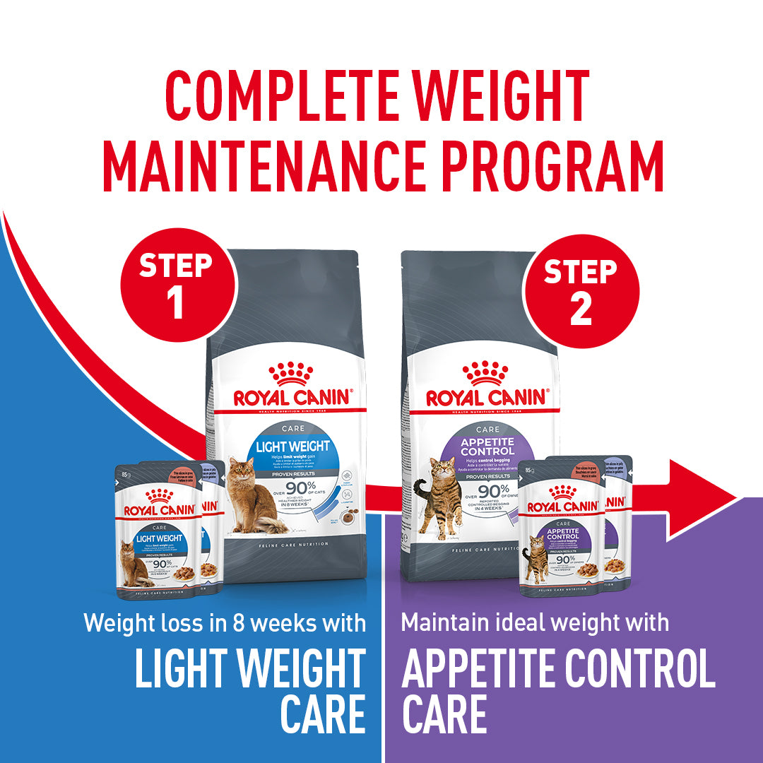 When cats beg for food and have easy access to it, they have a tendency to gain weight, which can negatively impact their health. Nutrition can play a role in helping reduce the feeling of hunger and maintaining a healthy weight. ROYAL CANIN® APPETITE CONTROL is a premium wet cat food precisely balanced with adapted protein and fat levels for healthy weight maintenance. Over 90% of owners reported controlled begging behaviour between meals in 4 weeks, when their cats were fed with ROYAL CANIN® APPETITE CONTROL CARE dry and wet formulas.**