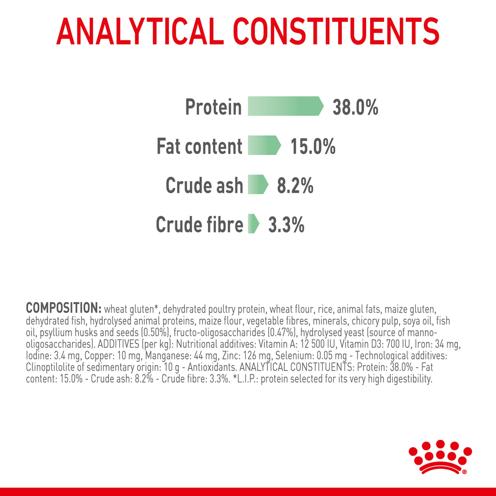 Composition Wheat gluten*, dehydrated poultry protein, wheat flour, rice, animal fats, maize gluten, dehydrated fish, hydrolysed animal proteins, maize flour, vegetable fibres, minerals, chicory pulp, soya oil, fish oil, psyllium husks and seeds (0.50%), fructooligosaccharides (0.47%), hydrolysed yeast (source of mannooligosaccharides). *L.I.P.: protein selected for its very high digestibility. Additives (per kg): Nutritional additives: Vitamin A: 12 500 IU, Vitamin D3: 700 IU, Iron: 34 mg, Iodine: 3.4 mg, Copper: 10 mg, Manganese: 44 mg, Zinc: 126 mg, Selenium: 0.05 mg. Technological additives: Clinoptilolite of sedimentary origin: 10 g Antioxidants.