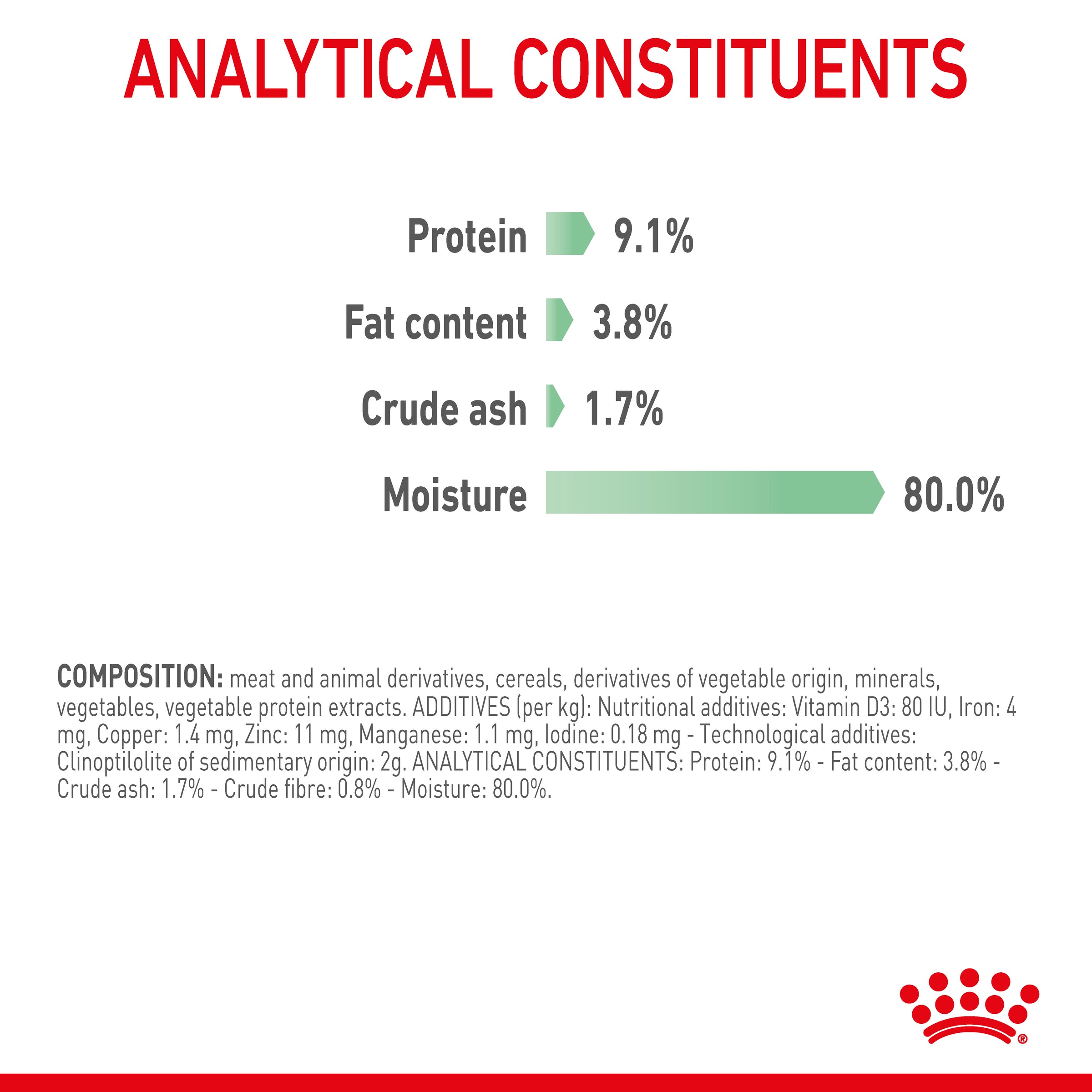 Composition Meat and animal derivatives, cereals, derivatives of vegetable origin, minerals, vegetables, vegetable protein extracts. Additives (per kg): Nutritional additives: Vitamin D3: 80 IU, Iron: 4 mg, Copper: 1.4 mg, Zinc: 11 mg, Manganese: 1.1 mg, Iodine: 0.18 mg. Technological additives: Clinoptilolite of sedimentary origin: 2g.