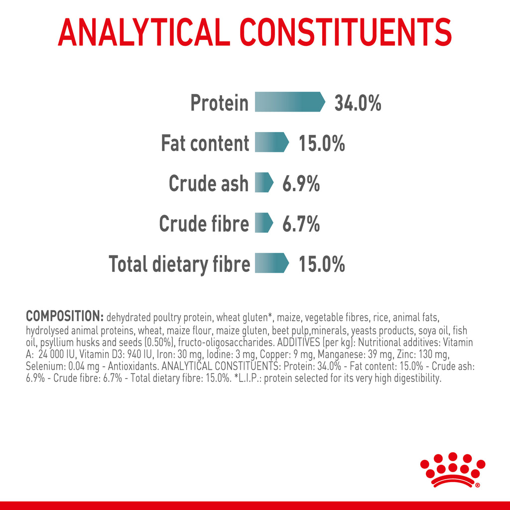 Composition Dehydrated poultry protein, wheat gluten*, maize, vegetable fibres, rice, animal fats, hydrolysed animal proteins, wheat, maize flour, maize gluten, beet pulp, minerals, yeasts products, soya oil, fish oil, psyllium husks and seeds (0.50%), fructooligosaccharides. *L.I.P.: protein selected for its very high digestibility. Additives (per kg): Nutritional additives: Vitamin A: 24 000 IU, Vitamin D3: 940 IU, Iron: 30 mg, Iodine: 3 mg, Copper: 9 mg, Manganese: 39 mg, Zinc: 130 mg, Selenium: 0.04 mg. Antioxidants.