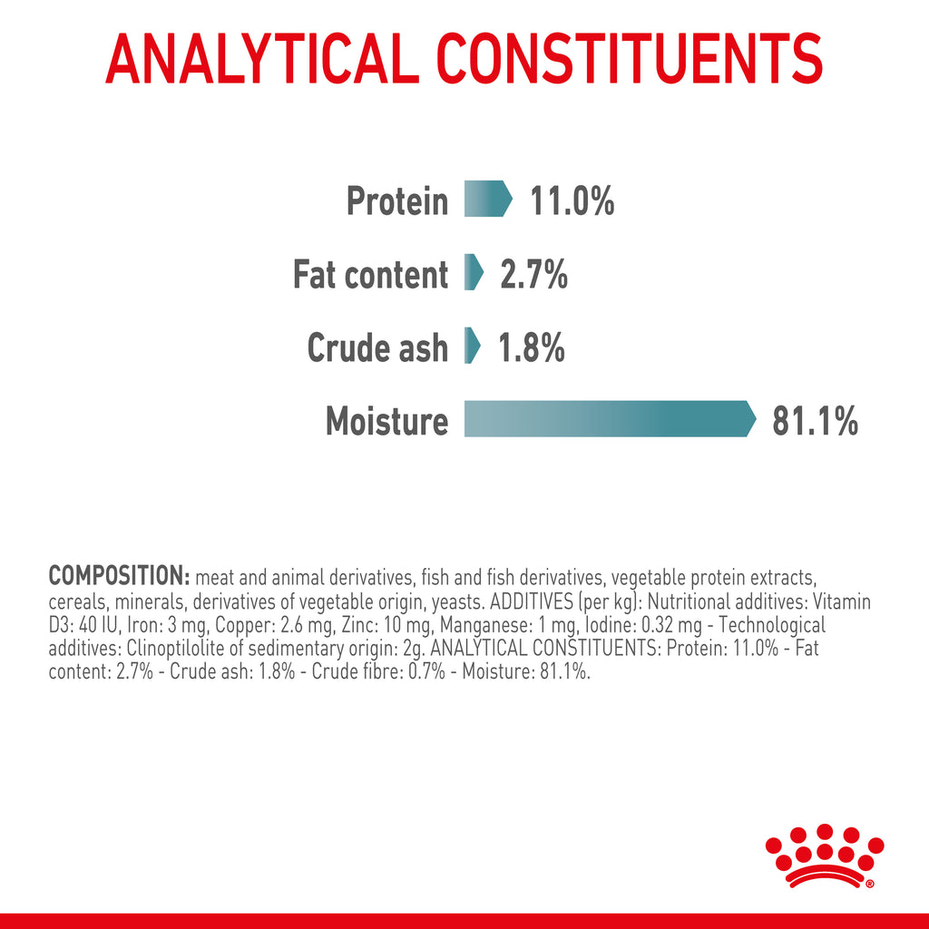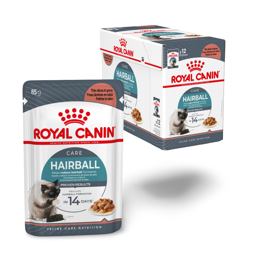 Cats spend a large portion of their day grooming, and therefore can swallow a large quantity of hair. This ingested hair can accumulate in the digestive tract, forming hairballs which can be either regurgitated or eliminated through the stools. For some cats, the accumulated hair leads to discomfort and more serious problems. ROYAL CANIN® HAIRBALL CARE is formulated to help stimulate intestinal transit to help naturally eliminate ingested hair. The exclusive use of ROYAL CANIN® HAIRBALL CARE wet formula is proven to reduce hairball formation in 14 days.*