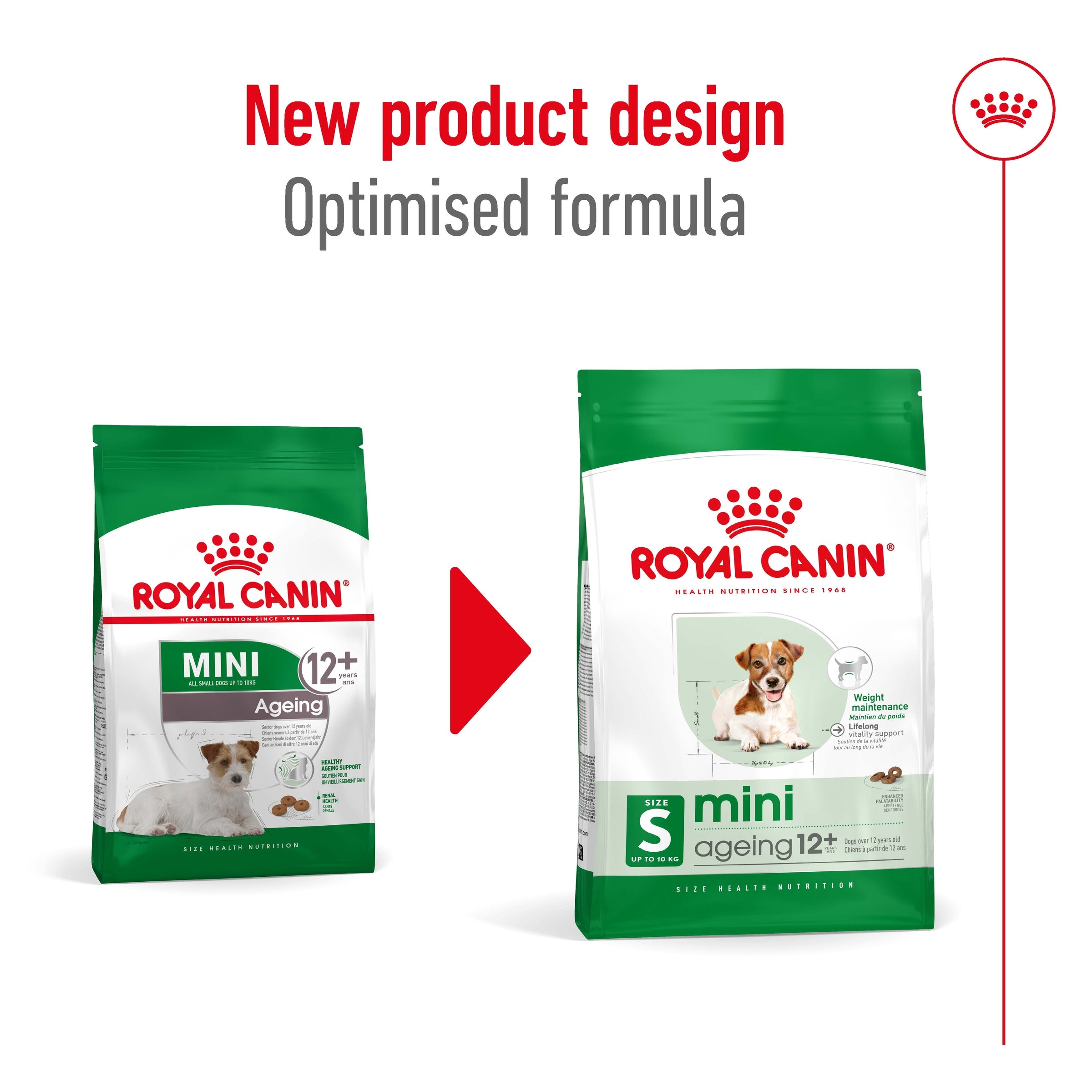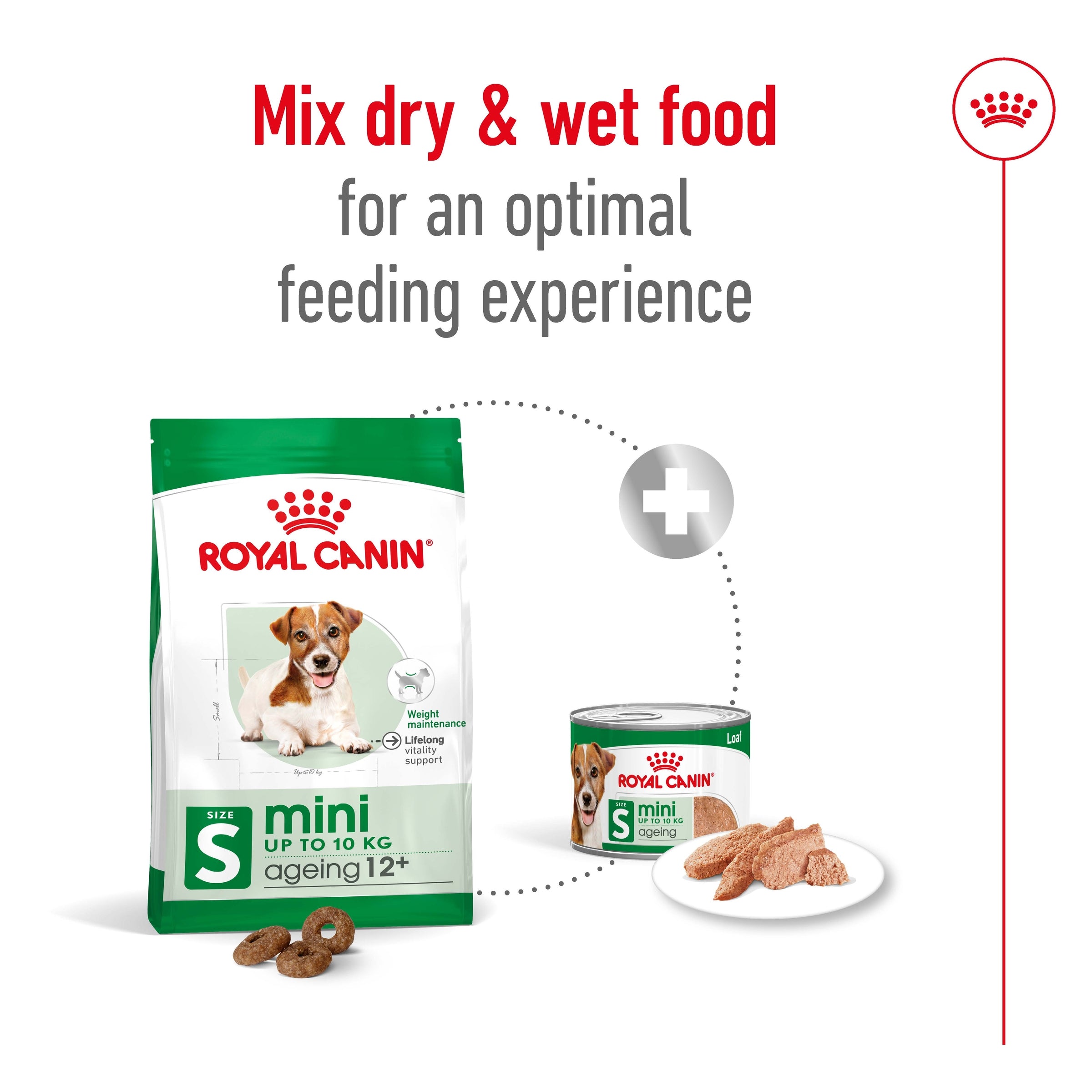 ROYAL CANIN® Mini Ageing 12+ is also available in two wet food textures: Loaf and Chunks In Gravy. Mixing dry kibble with stronger-smelling wet food can help to enhance the palatability of your senior dog’s meal, as ageing can cause a decline in the sense of smell.