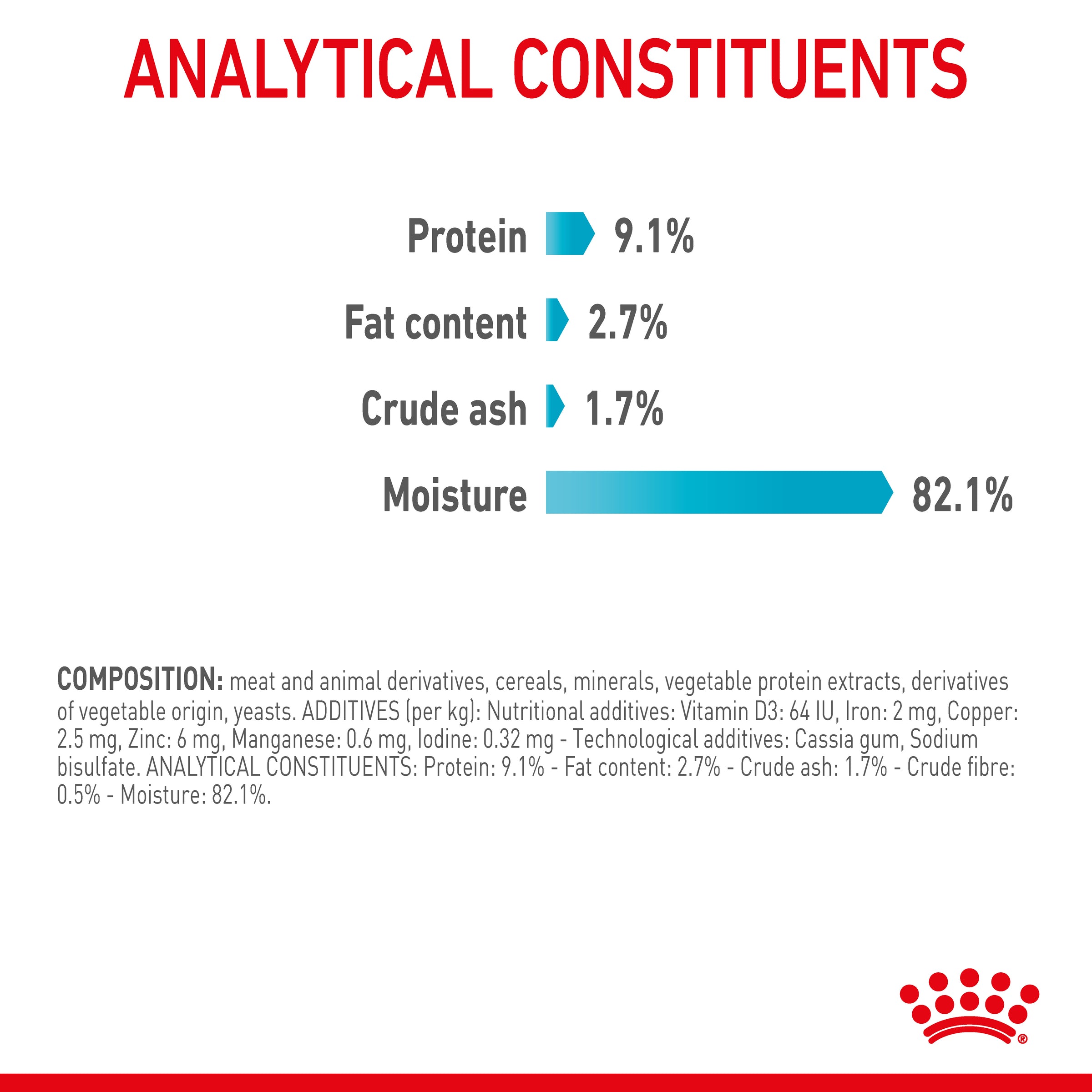Composition Meat and animal derivatives, cereals, minerals, vegetable protein extracts, derivatives of vegetable origin, yeasts. Additives (per kg): Nutritional additives: Vitamin D3: 64 IU, Iron: 2 mg, Copper: 2.5 mg, Zinc: 6 mg, Manganese: 0.6 mg, Iodine: 0.32 mg. Technological additives: Cassia gum, Sodium bisulfate.