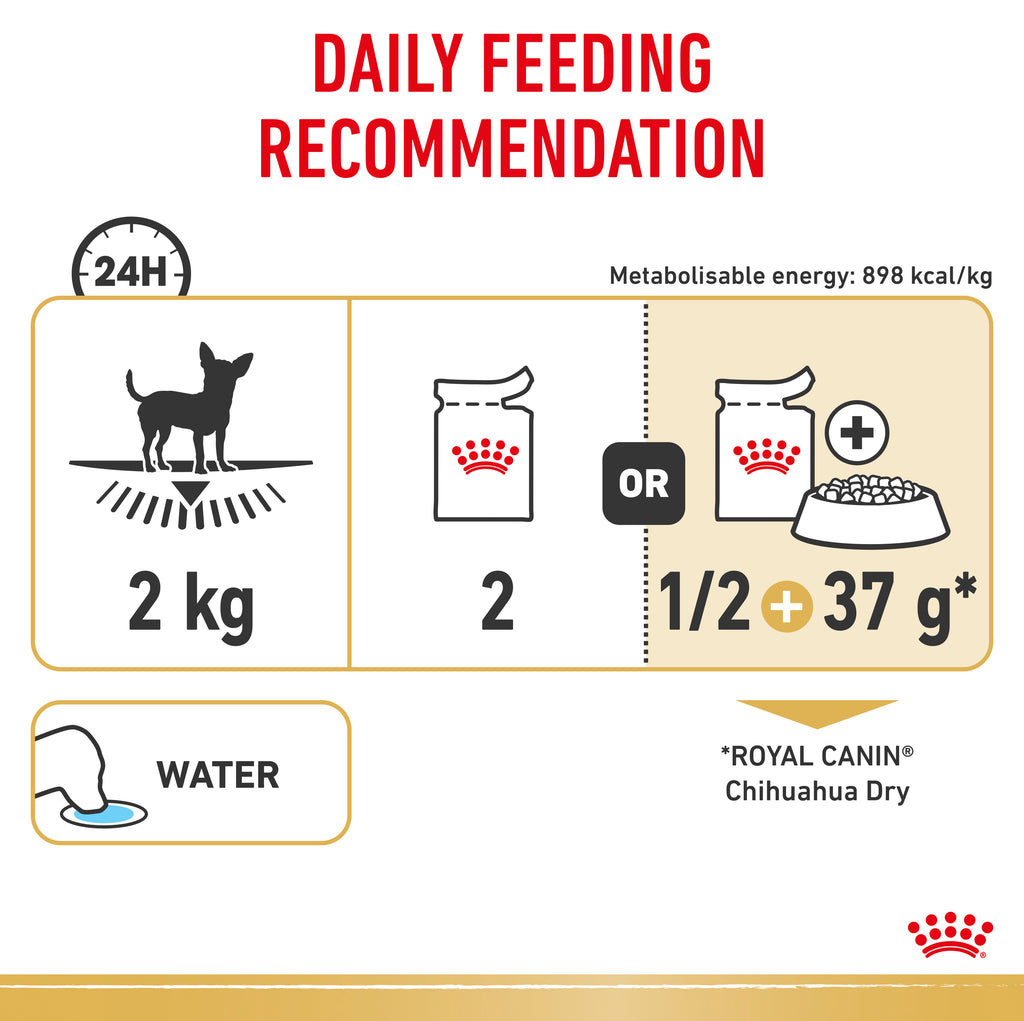 To cater to each dog’s individual preferences, Royal Canin® Chihuahua in Loaf is also available as dry food, with crunchy and tasty kibble. If you’re considering mixed feeding, simply follow our feeding guidelines to ensure your dog gets an accurate amount of both wet and dry food for optimal benefit.