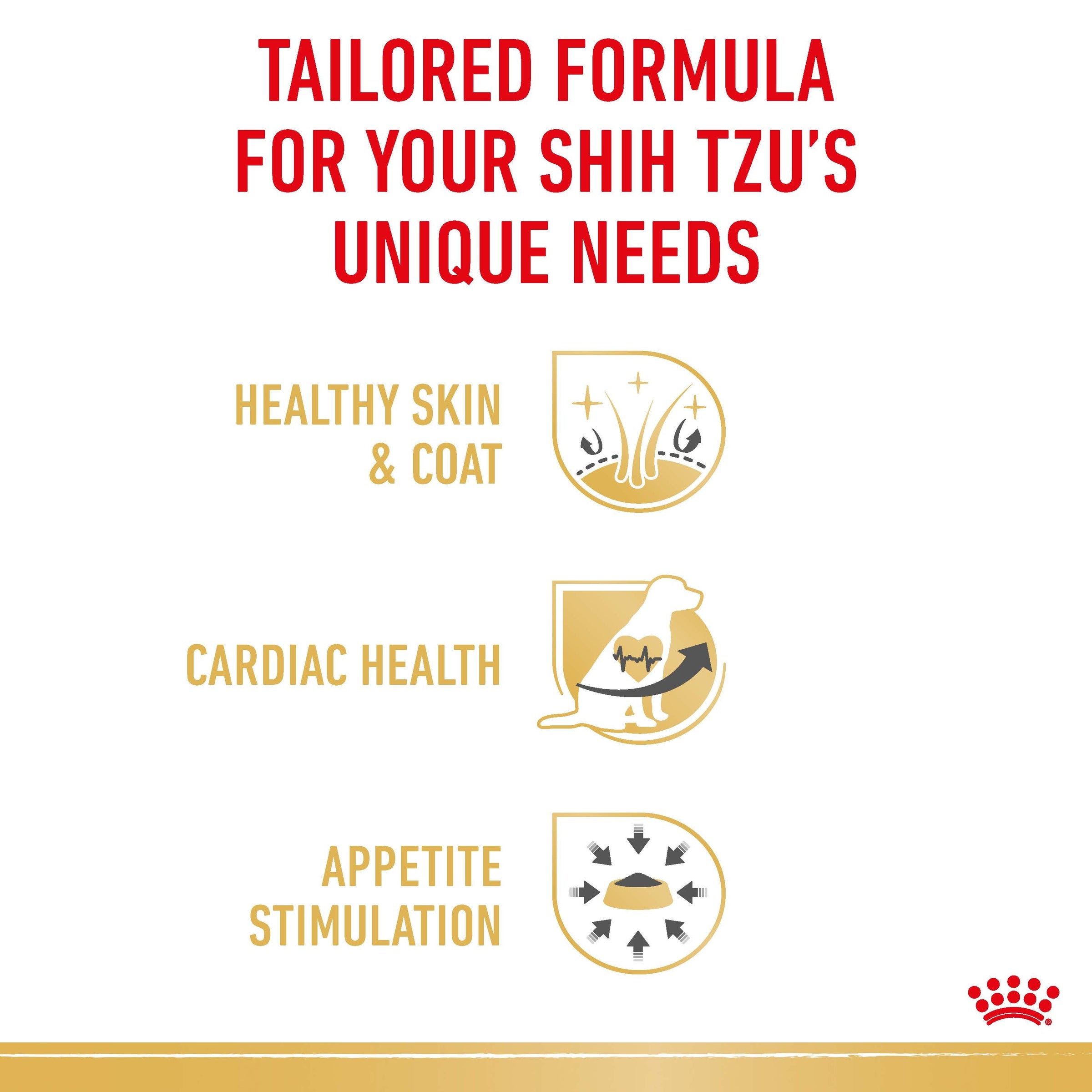 To appeal to each dog’s appetite, Royal Canin® Shih Tzu Adult is also available as dry food with crunchy, tailor-made kibble specially crafted to suit the size and shape of the Shih Tzu’s jaw. If your dog enjoys a diet of both wet and dry food, be sure to check the on-pack feeding guides to make sure you provide an accurate amount of each.