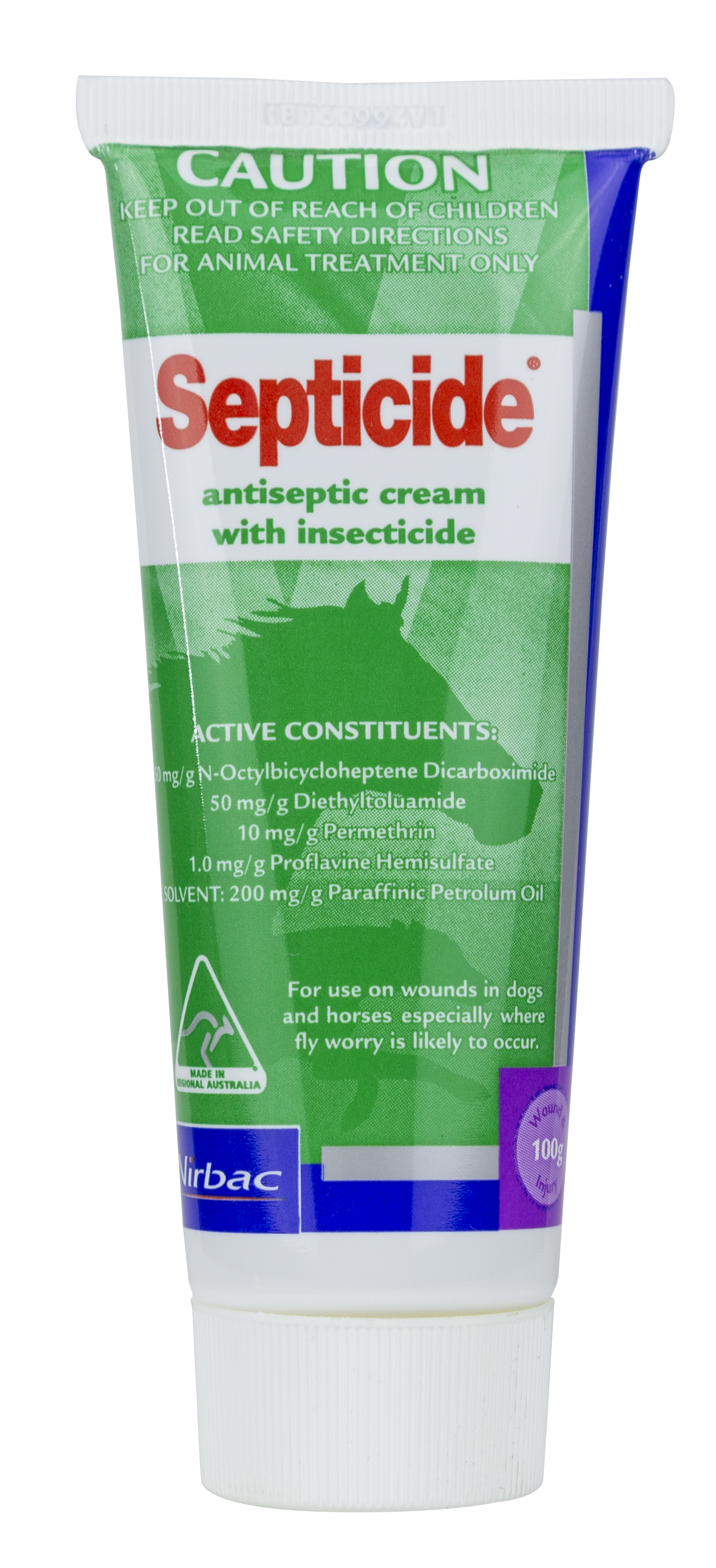 The active ingredients in SEPTICIDE are highly effective insecticidal compounds. The insecticide permethrin is one of the most effective insecticides available to kill insects landing on treated areas and to protect the wound from flystrike or other insect related damage. N Octyl Bicycloheptene Dicarboximide when combined with permethrin acts synergistically to prolong and intensify insecticidal activity.