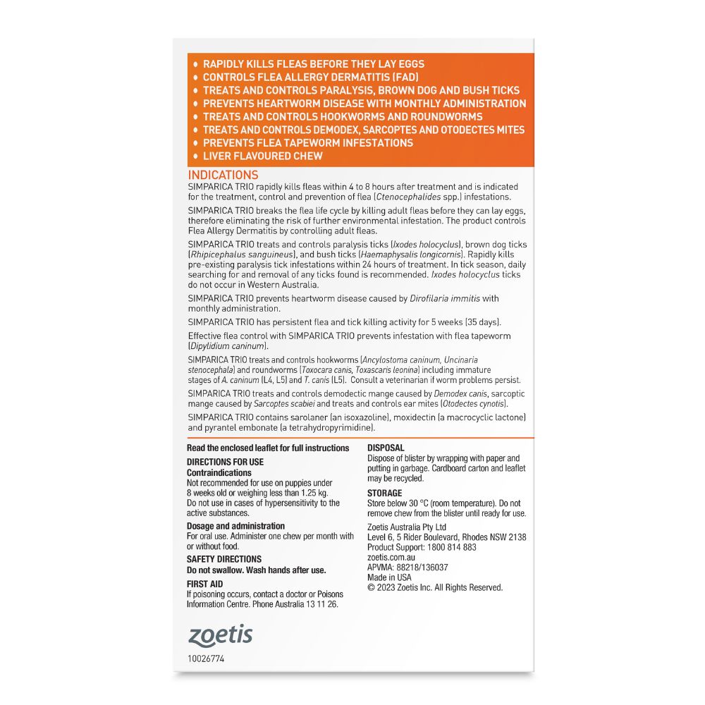 [{"id":41944444010678,"title":"3 Pack","option1":"3 Pack","option2":null,"option3":null,"sku":"10022163","requires_shipping":true,"taxable":true,"featured_image":{"id":40663154032822,"product_id":7507788038326,"position":1,"created_at":"2026-02-05T10:39:04+10:00","updated_at":"2026-02-05T10:40:45+10:00","alt":null,"width":1000,"height":1000,"src":"\/\/yourpetpa.com.au\/cdn\/shop\/files\/1_3968e7d8-3a2c-49cd-82f9-12a2de47004c.png?v=1770252045","variant_ids":[41944444010678]},"available":true,"name":"Simparica TRIO For Dogs 5.1-10kg Orange Small - 3 Pack","public_title":"3 Pack","options":["3 Pack"],"price":4835,"weight":50,"compare_at_price":6850,"inventory_management":"shopify","barcode":"5414736046853","featured_media":{"alt":null,"id":32133334728886,"position":1,"preview_image":{"aspect_ratio":1.0,"height":1000,"width":1000,"src":"\/\/yourpetpa.com.au\/cdn\/shop\/files\/1_3968e7d8-3a2c-49cd-82f9-12a2de47004c.png?v=1770252045"}},"requires_selling_plan":false,"selling_plan_allocations":[{"price_adjustments":[{"position":1,"price":4593}],"price":4593,"compare_at_price":4835,"per_delivery_price":4593,"selling_plan_id":4038918326,"selling_plan_group_id":"f3baea5d3e8e9cccd14c397bf1beb4e9e941dc84"},{"price_adjustments":[{"position":1,"price":4593}],"price":4593,"compare_at_price":4835,"per_delivery_price":4593,"selling_plan_id":4020404406,"selling_plan_group_id":"f3baea5d3e8e9cccd14c397bf1beb4e9e941dc84"},{"price_adjustments":[{"position":1,"price":4593}],"price":4593,"compare_at_price":4835,"per_delivery_price":4593,"selling_plan_id":4034298038,"selling_plan_group_id":"f3baea5d3e8e9cccd14c397bf1beb4e9e941dc84"},{"price_adjustments":[{"position":1,"price":4593}],"price":4593,"compare_at_price":4835,"per_delivery_price":4593,"selling_plan_id":4034330806,"selling_plan_group_id":"f3baea5d3e8e9cccd14c397bf1beb4e9e941dc84"},{"price_adjustments":[{"position":1,"price":4593}],"price":4593,"compare_at_price":4835,"per_delivery_price":4593,"selling_plan_id":4034363574,"selling_plan_group_id":"f3baea5d3e8e9cccd14c397bf1beb4e9e941dc84"},{"price_adjustments":[{"position":1,"price":4593}],"price":4593,"compare_at_price":4835,"per_delivery_price":4593,"selling_plan_id":4034396342,"selling_plan_group_id":"f3baea5d3e8e9cccd14c397bf1beb4e9e941dc84"},{"price_adjustments":[{"position":1,"price":4593}],"price":4593,"compare_at_price":4835,"per_delivery_price":4593,"selling_plan_id":4038820022,"selling_plan_group_id":"f3baea5d3e8e9cccd14c397bf1beb4e9e941dc84"},{"price_adjustments":[{"position":1,"price":4593}],"price":4593,"compare_at_price":4835,"per_delivery_price":4593,"selling_plan_id":4038852790,"selling_plan_group_id":"f3baea5d3e8e9cccd14c397bf1beb4e9e941dc84"},{"price_adjustments":[{"position":1,"price":4593}],"price":4593,"compare_at_price":4835,"per_delivery_price":4593,"selling_plan_id":4038983862,"selling_plan_group_id":"6c819509c8de19993a9ff16dd38b8fb2fa1a7ee2"},{"price_adjustments":[{"position":1,"price":4593}],"price":4593,"compare_at_price":4835,"per_delivery_price":4593,"selling_plan_id":4039016630,"selling_plan_group_id":"6c819509c8de19993a9ff16dd38b8fb2fa1a7ee2"},{"price_adjustments":[{"position":1,"price":4593}],"price":4593,"compare_at_price":4835,"per_delivery_price":4593,"selling_plan_id":4039049398,"selling_plan_group_id":"6c819509c8de19993a9ff16dd38b8fb2fa1a7ee2"},{"price_adjustments":[{"position":1,"price":4593}],"price":4593,"compare_at_price":4835,"per_delivery_price":4593,"selling_plan_id":4039082166,"selling_plan_group_id":"6c819509c8de19993a9ff16dd38b8fb2fa1a7ee2"},{"price_adjustments":[{"position":1,"price":4593}],"price":4593,"compare_at_price":4835,"per_delivery_price":4593,"selling_plan_id":4039114934,"selling_plan_group_id":"6c819509c8de19993a9ff16dd38b8fb2fa1a7ee2"},{"price_adjustments":[{"position":1,"price":4593}],"price":4593,"compare_at_price":4835,"per_delivery_price":4593,"selling_plan_id":4039147702,"selling_plan_group_id":"6c819509c8de19993a9ff16dd38b8fb2fa1a7ee2"},{"price_adjustments":[{"position":1,"price":4593}],"price":4593,"compare_at_price":4835,"per_delivery_price":4593,"selling_plan_id":4039180470,"selling_plan_group_id":"6c819509c8de19993a9ff16dd38b8fb2fa1a7ee2"},{"price_adjustments":[{"position":1,"price":4593}],"price":4593,"compare_at_price":4835,"per_delivery_price":4593,"selling_plan_id":4039213238,"selling_plan_group_id":"6c819509c8de19993a9ff16dd38b8fb2fa1a7ee2"},{"price_adjustments":[{"position":1,"price":4593}],"price":4593,"compare_at_price":4835,"per_delivery_price":4593,"selling_plan_id":4039639222,"selling_plan_group_id":"6c819509c8de19993a9ff16dd38b8fb2fa1a7ee2"},{"price_adjustments":[{"position":1,"price":4593}],"price":4593,"compare_at_price":4835,"per_delivery_price":4593,"selling_plan_id":4039671990,"selling_plan_group_id":"6c819509c8de19993a9ff16dd38b8fb2fa1a7ee2"},{"price_adjustments":[{"position":1,"price":4593}],"price":4593,"compare_at_price":4835,"per_delivery_price":4593,"selling_plan_id":4039704758,"selling_plan_group_id":"6c819509c8de19993a9ff16dd38b8fb2fa1a7ee2"},{"price_adjustments":[{"position":1,"price":4593}],"price":4593,"compare_at_price":4835,"per_delivery_price":4593,"selling_plan_id":4039737526,"selling_plan_group_id":"6c819509c8de19993a9ff16dd38b8fb2fa1a7ee2"},{"price_adjustments":[{"position":1,"price":4593}],"price":4593,"compare_at_price":4835,"per_delivery_price":4593,"selling_plan_id":4039770294,"selling_plan_group_id":"6c819509c8de19993a9ff16dd38b8fb2fa1a7ee2"},{"price_adjustments":[{"position":1,"price":4593}],"price":4593,"compare_at_price":4835,"per_delivery_price":4593,"selling_plan_id":4039803062,"selling_plan_group_id":"6c819509c8de19993a9ff16dd38b8fb2fa1a7ee2"},{"price_adjustments":[{"position":1,"price":4593}],"price":4593,"compare_at_price":4835,"per_delivery_price":4593,"selling_plan_id":4039835830,"selling_plan_group_id":"6c819509c8de19993a9ff16dd38b8fb2fa1a7ee2"},{"price_adjustments":[{"position":1,"price":4593}],"price":4593,"compare_at_price":4835,"per_delivery_price":4593,"selling_plan_id":4039868598,"s